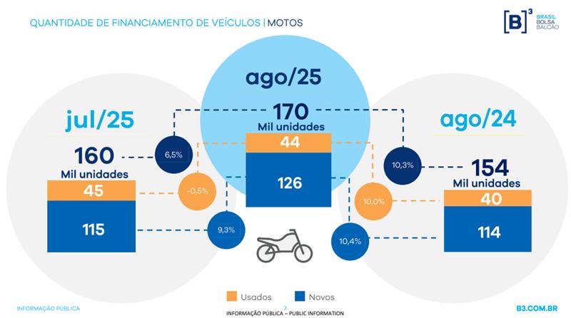 As vendas financiadas de motos no Brasil avançaram 10,3% em agosto de 2025 em comparação ao mesmo período de 2024, segundo dados divulgados pela B3. Frente a julho deste ano, o crescimento foi de 6,5%, confirmando a tendência de maior procura por motocicletas, impulsionada por fatores como custo reduzido, agilidade no trânsito e uso crescente em serviços de entrega.
