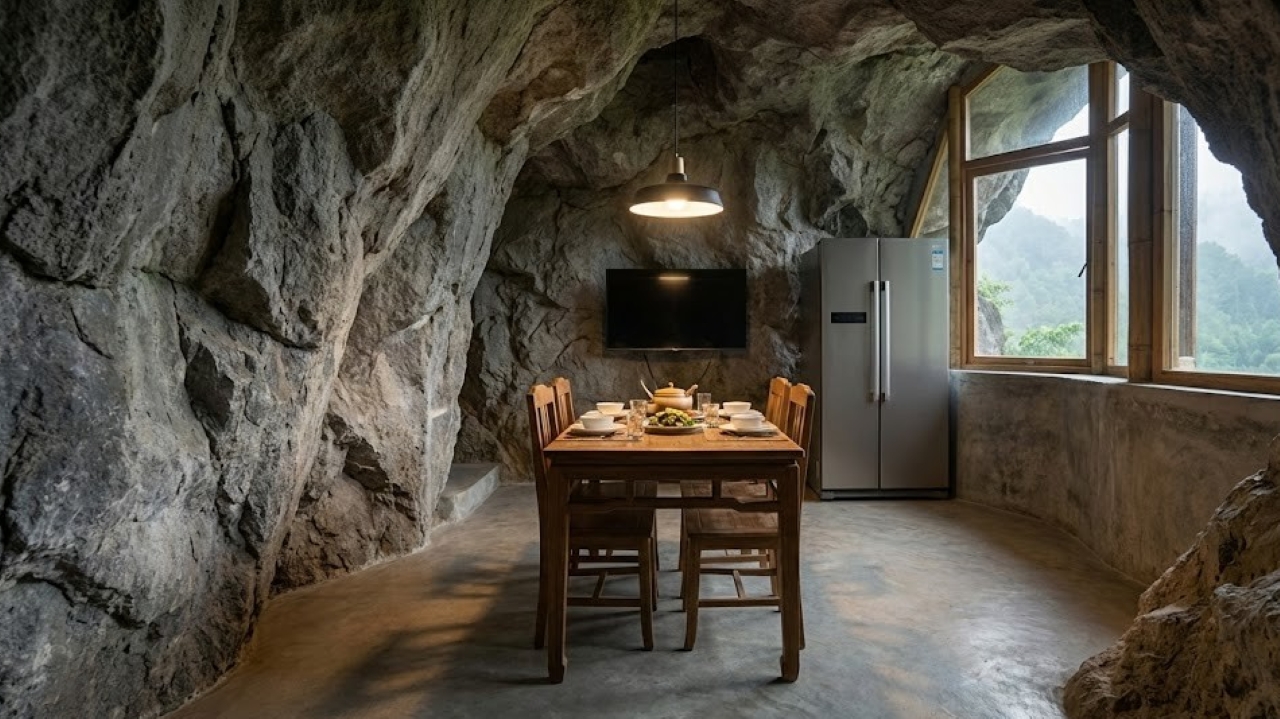 Diferente da imagem primitiva que o termo sugere, a vida dessa família na caverna é surpreendentemente moderna. A habitação, situada no antigo vilarejo de Yingshang (Zhijin), conta com eletricidade, eletrodomésticos como geladeira e forno, e até sinal de internet. A estrutura interna é feita de madeira, protegida pelo teto natural de rocha que mantém a temperatura agradável o ano todo, fresca no verão e quente no inverno.