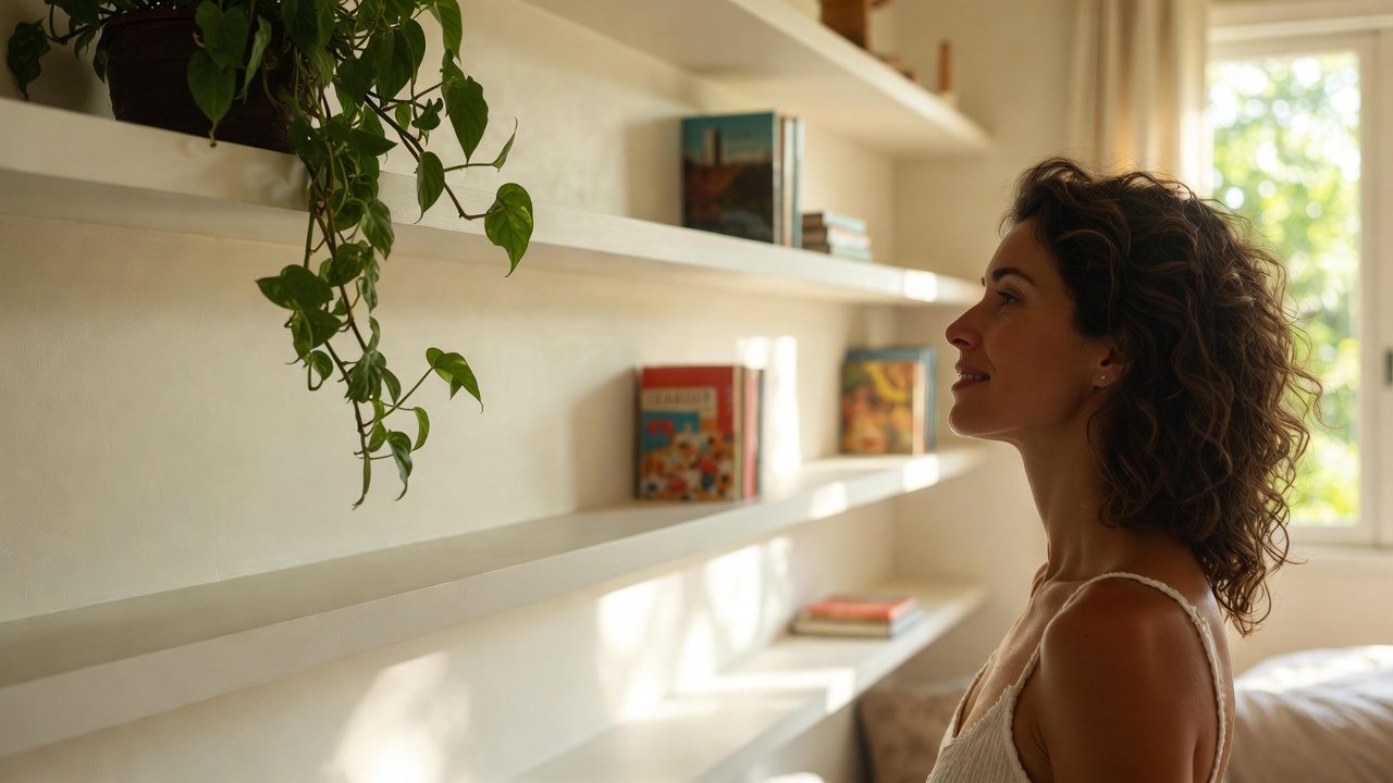 Pintar as pesadas prateleiras do quarto usando o tom exato da parede muda tudo. O incrível efeito de camuflagem esconde objetos pesados e amplia apartamentos compactos com imensa rapidez.