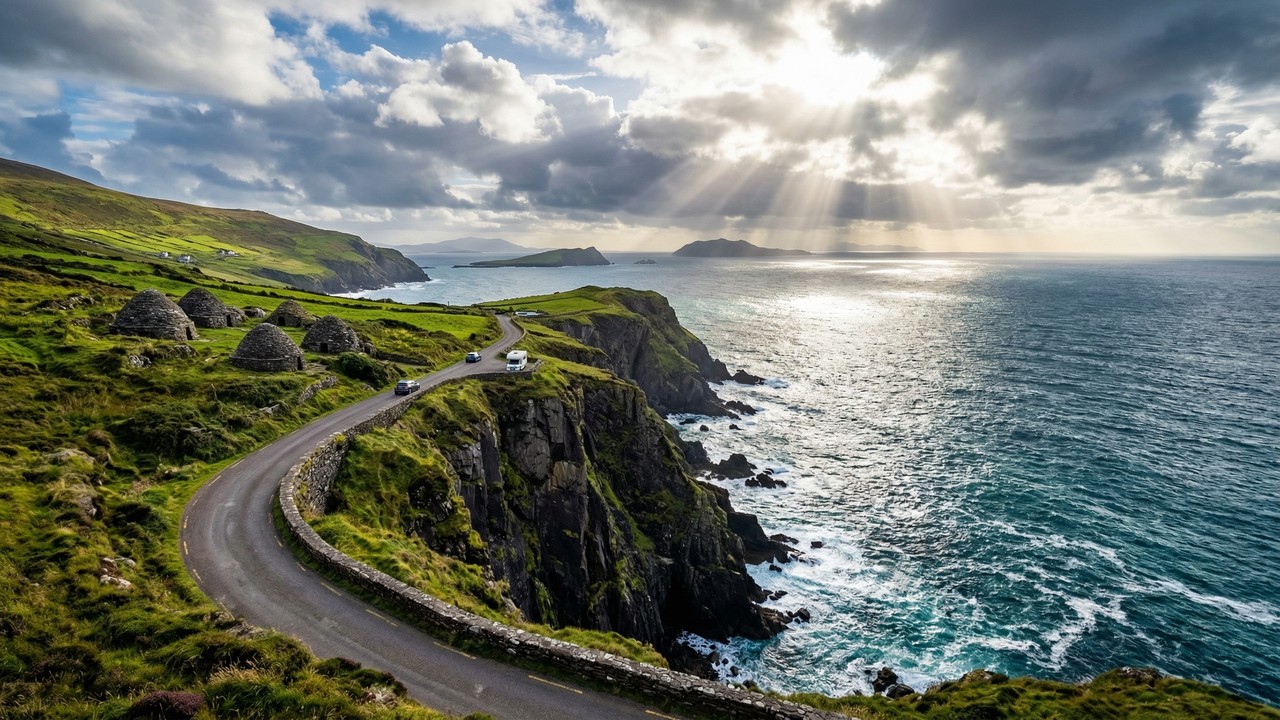 A Slea Head Drive percorre 47 km pela Península de Dingle, no extremo oeste da Irlanda. Com suas curvas sobre falésias e vistas para o oceano, a rodovia é amplamente considerada a rota cênica mais bela de todo o continente europeu.