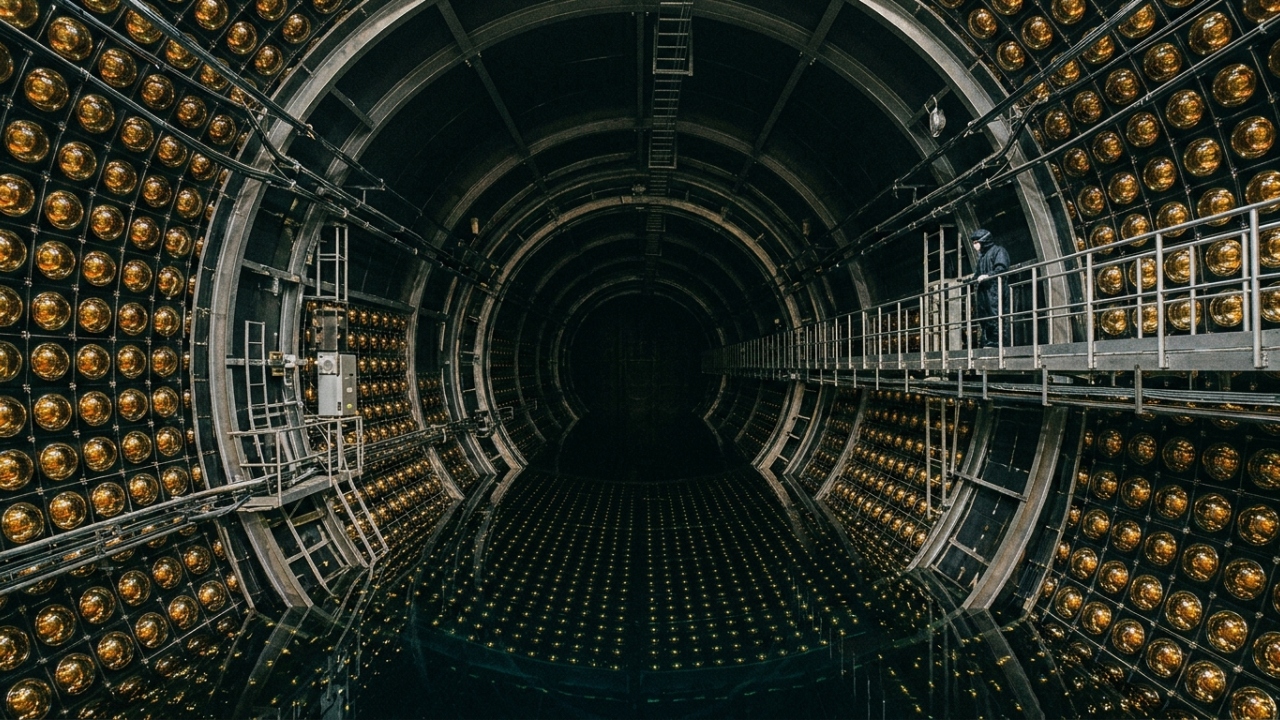 As paredes cilíndricas do observatório são forradas por 11.200 tubos fotomultiplicadores gigantes (com aparência de lâmpadas douradas). Esses sensores são tão sensíveis que podem detectar a luz de uma única vela na lua. Eles capturam a fraca luz azul gerada quando um neutrino atinge a água ultrapura.