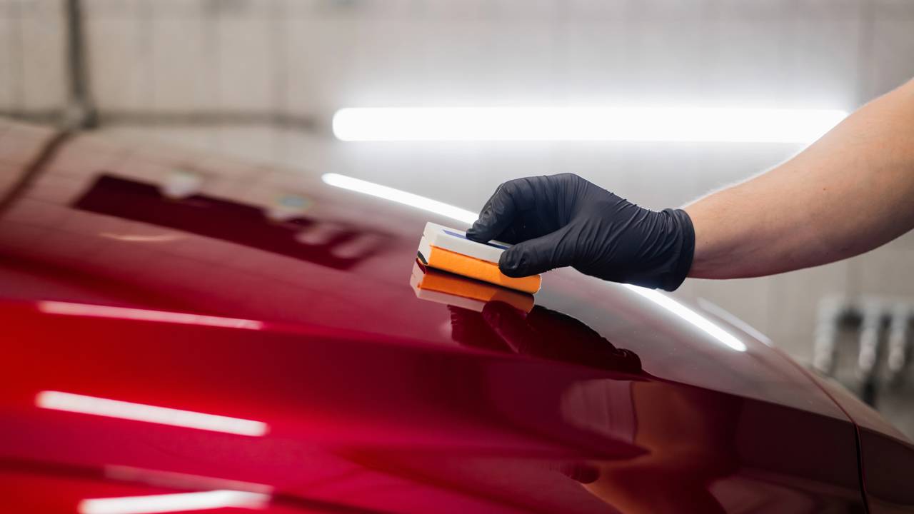 Funcionário de um estúdio de detalhamento automotivo aplicando revestimento cerâmico na pintura de um carro com um aplicador de esponja - Créditos: depositphotos.com / romankosolapov