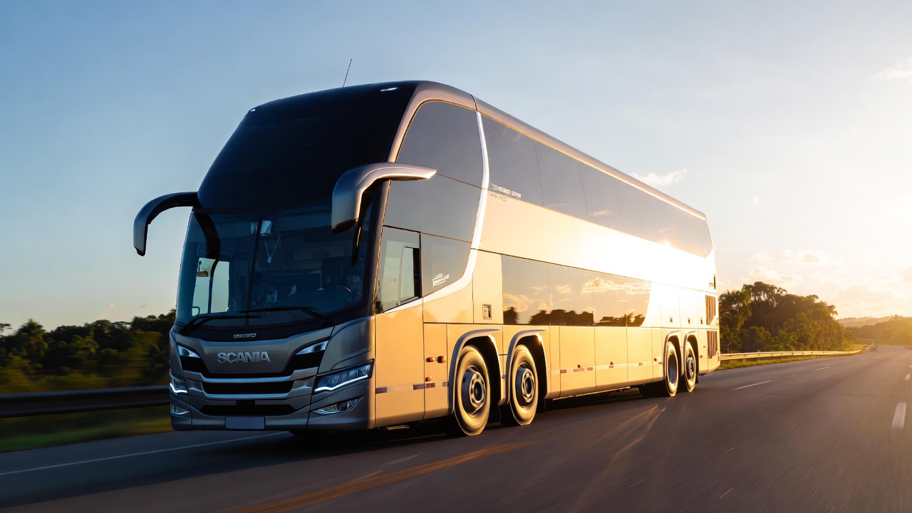 Grande ônibus rodoviário Scania de quatro eixos circulando por estrada interestadual moderna