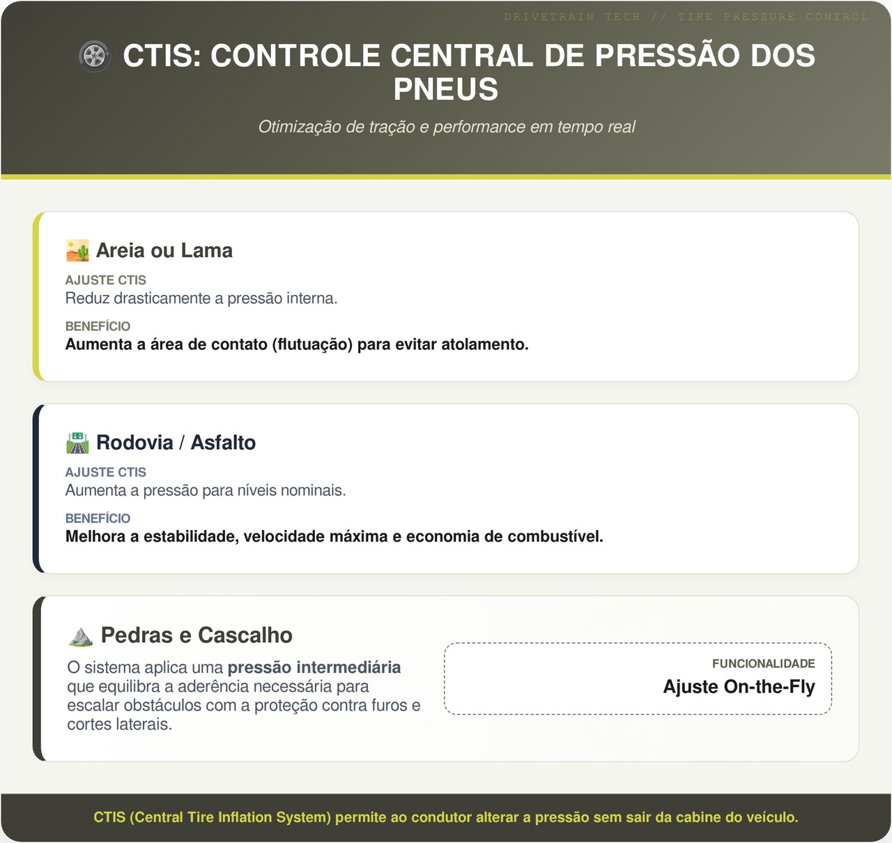 O CTIS opera de forma simples e eficiente, adaptando o veículo a qualquer superfície: