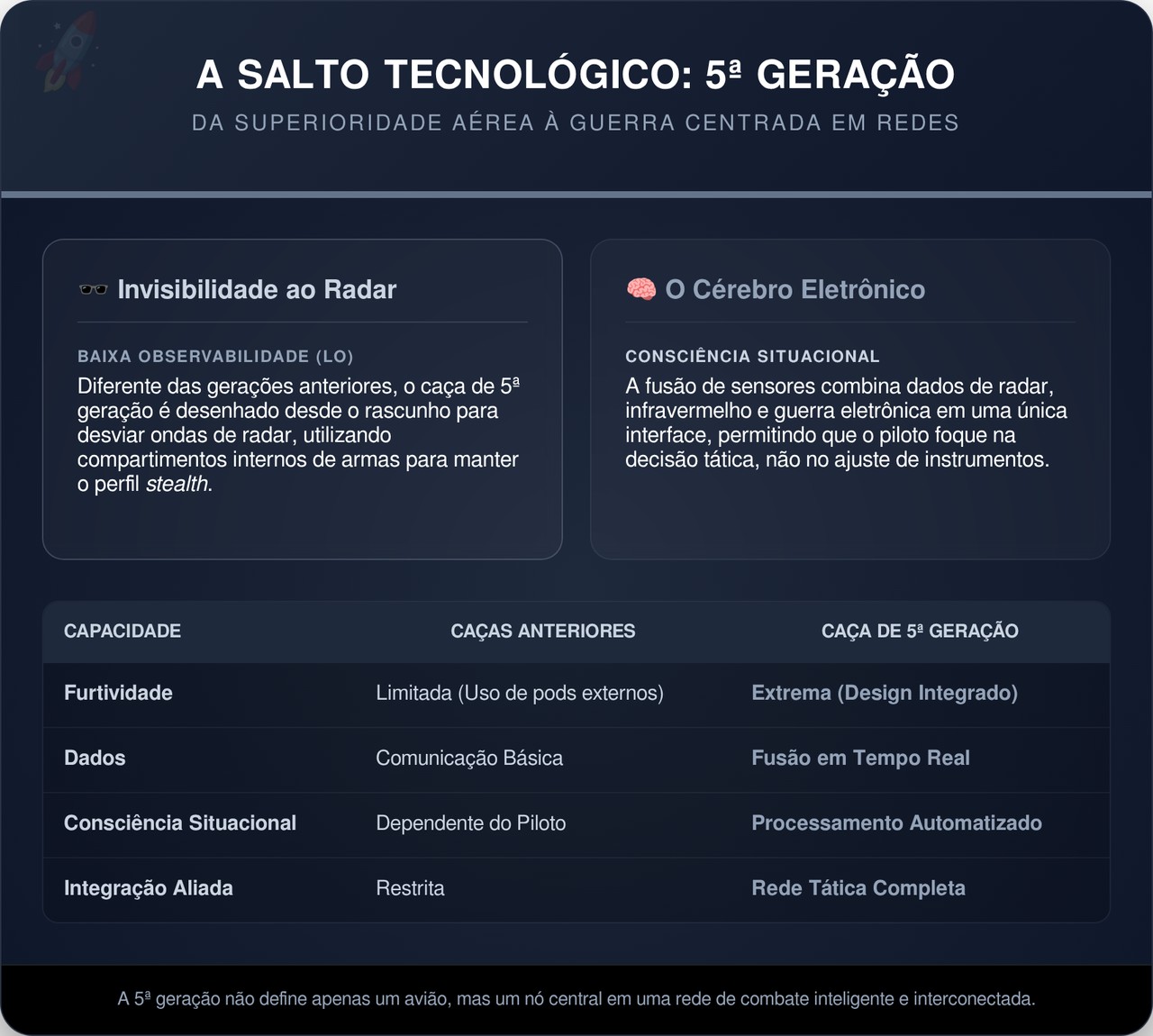 Os caças de 5ª geração funcionam como supercomputadores voadores ao processar em milissegundos informações que antes demoravam para chegar ao piloto ou ao comando terrestre. Essa rede ativa permite que aliados compartilhem dados de ameaça e posição instantaneamente, integrando forças aéreas, navais e terrestres em uma única batalha coordenada.