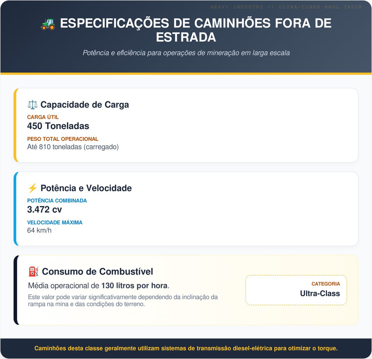 O BelAZ impressiona não só pelo tamanho, mas pelos números que carrega. Confira os dados técnicos principais: