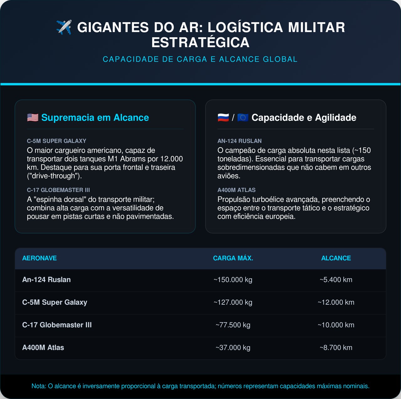 O An-124 supera o C-5M em tonelagem, mas o Super Galaxy combina capacidade e alcance de forma mais equilibrada para missões estratégicas globais.