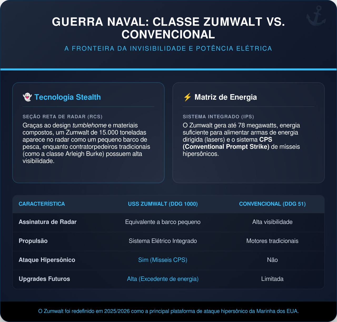 O Zumwalt e sua classe representam uma nova filosofia de guerra naval baseada em furtividade, automação e dissuasão de alto impacto. Com integrações de mísseis hipersônicos e sistemas de combate modernos, o navio abre caminho para projetos futuros que podem dominar o mar sem serem detectados.