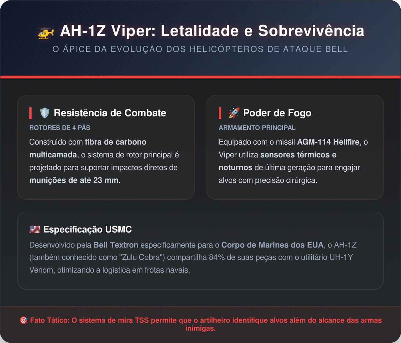 Mais do que uma aeronave de ataque, o Viper representa uma filosofia de combate: resistir ao impacto, manter a missão e retornar, redefinindo o que se espera de um helicóptero de guerra moderno.