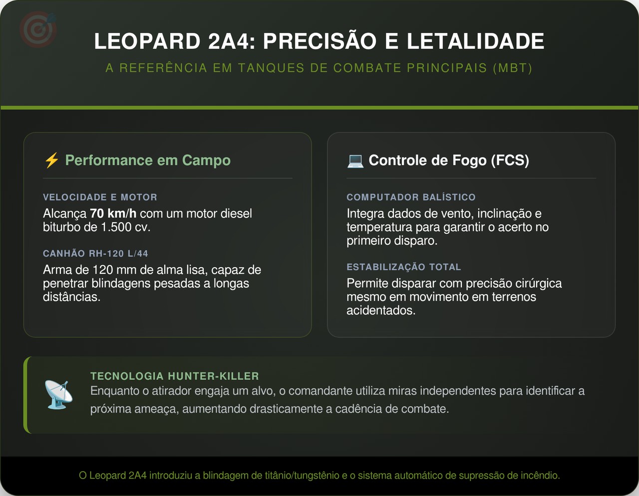 O tanque alemão segue sendo referência em engenharia militar ocidental, especialmente em um cenário onde a guerra mecanizada exige cada vez mais velocidade de decisão e capacidade de engajamento em movimento.